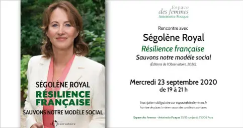 Mercredi 23 septembre 2020 de 19h à 21h35 rue Jacob 75006 ParisRencontre avec Ségolène Royal pour son dernier livre Résilience française, Sauvons notre modèle social (Éditions de l’Observatoire, 2020).