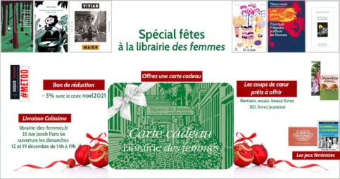 Jusqu'au 31 décembre35 rue Jacob 75006 ParisNe cherchez plus, vos cadeaux sont à la librairie des femmes avec des offres spéciales fêtes jusqu’au 31 décembre 2021. À découvrir sur le site de la librairie ici ou à la librairie des femmes qui sera aussi ouverte les dimanches 12 et 19 décembre 2021 de 14h à 19h.