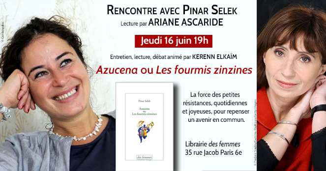 Jeudi 16 juin à 19h35 rue Jacob 75006 ParisRencontre avec Pinar Selek autour de son livre Azucena ou Les fourmis zinzines et lecture par Ariane Ascaride. Entretien, lecture, débat animé par Kerenn Elkaïm.